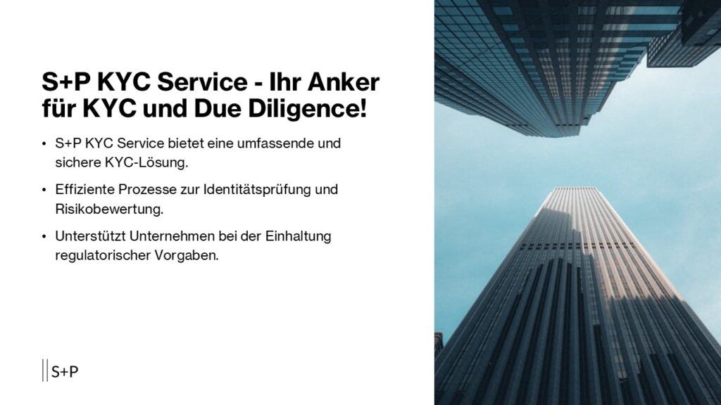 Onboarding mit Sicherheit: S+P KYC Service – Ihr Anker für KYC und Due Diligence! Optimieren Sie Ihr Neukunden-Onboarding und schaffen Sie positive Kundenerlebnisse mit S+P KYC Service. Wir übernehmen die anspruchsvolle Aufgabe der Kundenidentifikation und -überprüfung und entlasten Sie, sodass Sie sich auf Ihr Kerngeschäft konzentrieren...