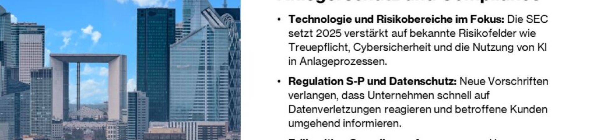 SEC legt Prüfungsschwerpunkte für 2025 fest – Fokus auf Anlegerschutz und Compliance Am 22. Oktober 2024 veröffentlichte die US-Börsenaufsicht, die Securities and Exchange Commission (SEC), ihre jährlichen Prüfungsschwerpunkte für das Geschäftsjahr 2025. Wie auch im Vorjahr konzentrieren sich die Schwerpunkte auf Risikobereiche wie Treuepflicht, Verhaltensstandards, Cybersicherheit und künstliche Intelligenz (KI). Die Veröffentlichung erfolgt diesmal bereits […]